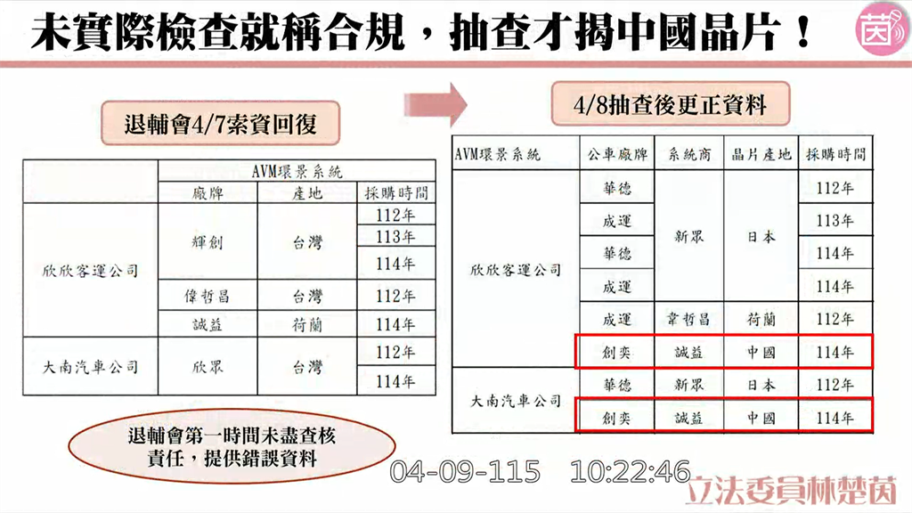 有中國製晶片的電動公車廠牌為「創奕」、系統商為「誠益」。圖/翻攝自立院IVOD退輔會主委嚴德發回應此事非常嚴重,依採購合約是「不可使用中國產製品」,且也有簽立切結書,因此確實有違規的情況。退輔會會成立專案小組做全面的普查,看還有哪些晶片是屬於中國公司的,也會提出求償、向廠商追償,按照契約且要求更換產品。