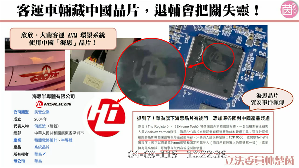 民進黨立委林楚茵今(9)日在立院質詢時指出,退輔會所屬的欣欣客運與大南客運,於2025年所採購、在雙北運營的電動公車,其環景系統的晶片竟是中國華為旗下的「海思公司」所製造,恐有嚴重的國安疑慮。