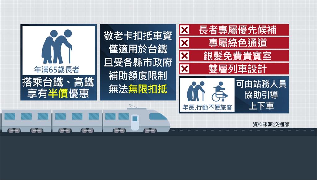 依照雙鐵現行優惠,年滿65歲長者,搭乘台鐵、高鐵會有半價優惠,其中敬老卡只適用在台鐵,且受到地方政府補助額度限制;高鐵方面則沒有敬老卡折抵服務,也不存在無限額度使用,當然也沒有以年齡區分的長者專屬綠色通道、銀髮免費貴賓室。