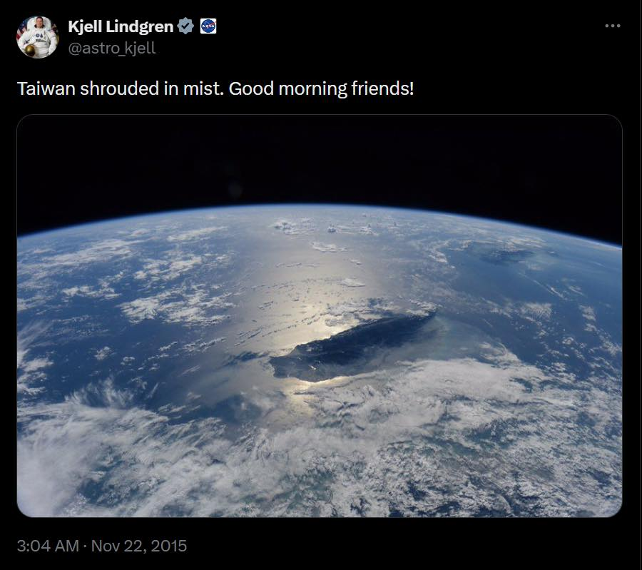 林琪兒2015年執行太空任務時,從國際太空站拍攝了雲霧繚繞的美麗台灣,並於個人社群媒體與大眾分享。圖/AIT提供
