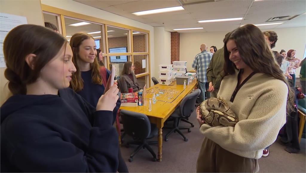 蛇成了學生們的紓壓好夥伴。圖/CNN療癒小狗恐怕已經不夠看?加拿大東岸的阿卡迪亞大學,除了開設蛇類課程,課餘時間這些爬蟲類還成了學生的「紓壓夥伴」。不過負責人也坦承,有些學生看到蛇,還是克服不了心中恐懼。