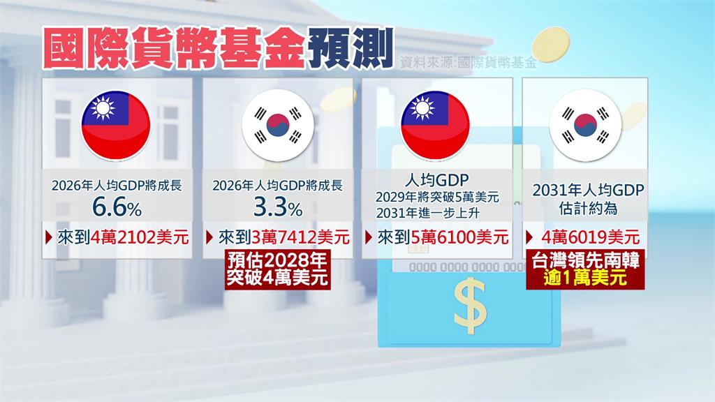 受惠AI需求與出口強勁,台灣經濟成長越來越強,去年人均GDP首度超車南韓,未來領先的差距也可能進一步擴大。根據國際貨幣基金預測,今年台灣人均GDP將成長6.6%到4萬2102美元,南韓則增長3.3%到3萬7412美元。