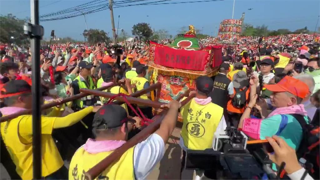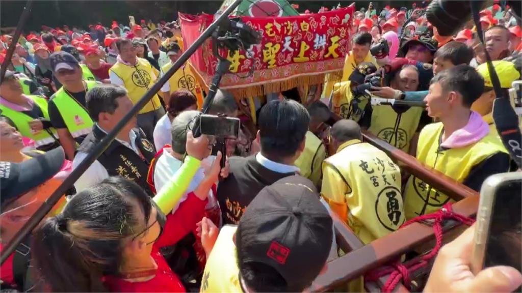 苗栗拱天宮白沙屯媽祖8天7夜進香活動來到尾聲,今(20)天媽祖鑾轎前往秋茂園進行換轎儀式,從四人扛的輕便神轎換成華麗莊嚴的八抬大轎,山邊媽祖也換乘自己的轎式,現場擠滿數十萬名信徒齊喊「進喔!」見證,場面相當壯觀,而白沙屯媽祖預計下午4點左右就會抵達拱天宮,進行安座大典。