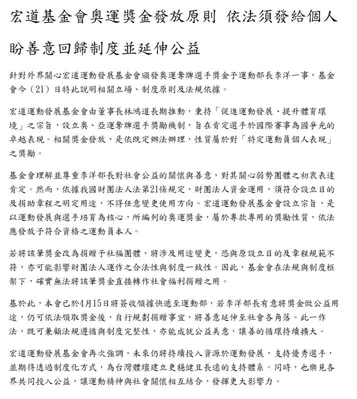 宏道基金會今(21)日發聲明指出,依相關法令,該獎金性質屬於對「特定運動員個人表現」的獎勵,僅能匯入達標國手的個人帳戶,不得任意變更用途,若改為捐贈社福團體,可能涉及用途變更,與原設立目的及章程規範不符。