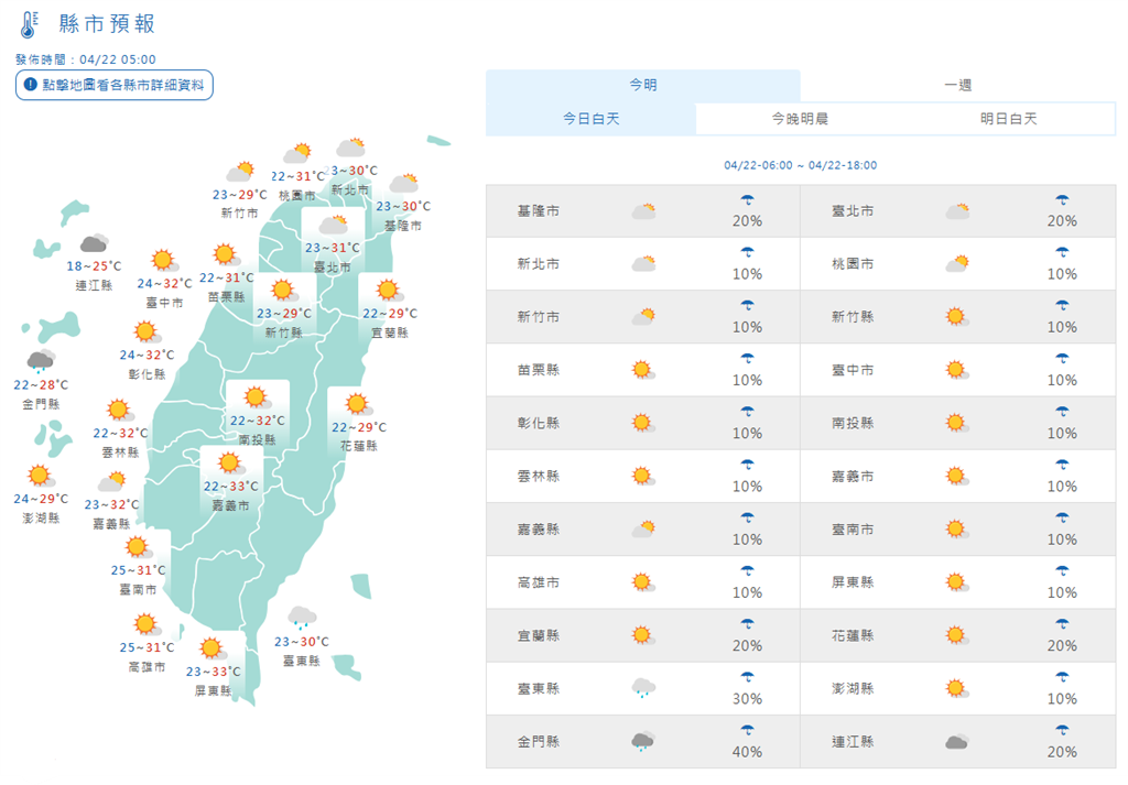 今(22)天持續高溫炎熱,各地白天高溫普遍在30度左右,南部近山區可能上看36度以上。氣象專家林得恩說明,這是因為鋒面逐漸接近,白天適位於春雨鋒面的「鋒前暖區」,氣溫較高、體感悶熱。