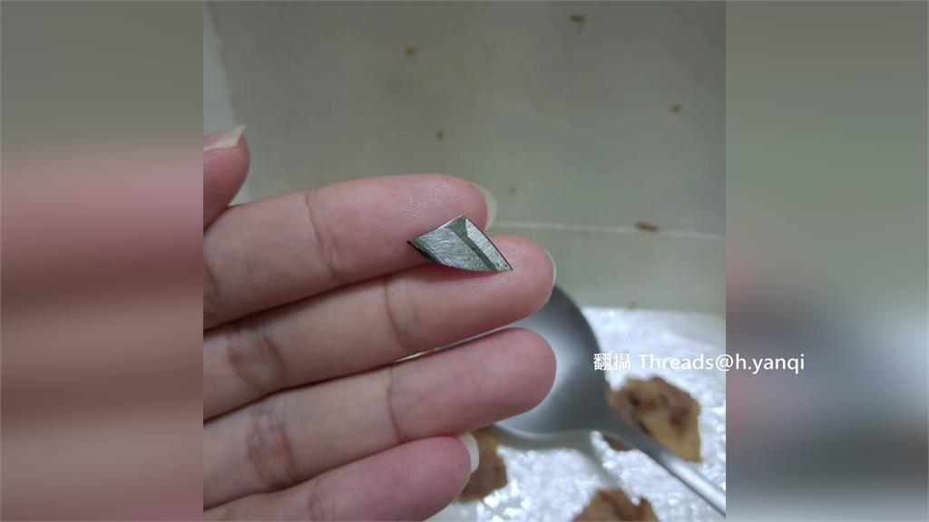 飯中的刀片相當銳利。圖/翻攝自Threads@h.yanqi而當事業者承認作業有疏失致歉,指出主因就是切肉機刀片釀禍,刀片老化掉到肉裡面,過程中又沒有檢查到,目前已經把機器送去維修做檢查。