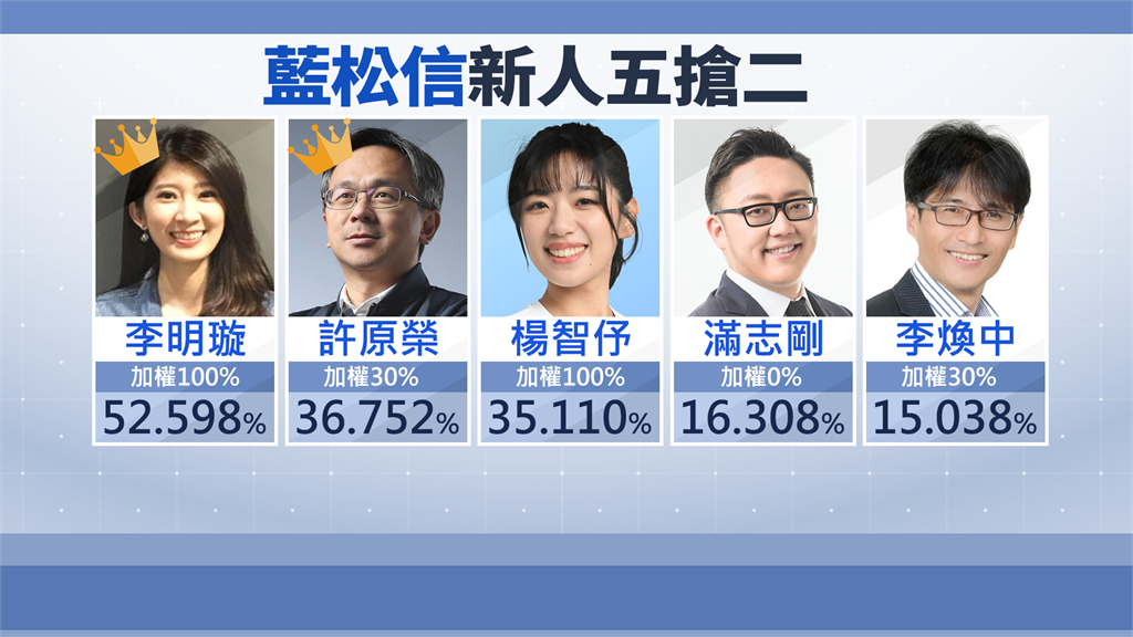 北市第三選區松山信義區議員初選,國民黨黨內新人5搶2戰況激烈,今天揭曉民調數據,國民黨台北市黨部主委戴錫欽宣布,經過加權之後,由李明璇和許原榮獲得勝利,李明璇直呼,到現在心情都還是覺得很激動,但也強調今天不是勝利,只是拿到了一張門票,接下來大選才是最重要的。