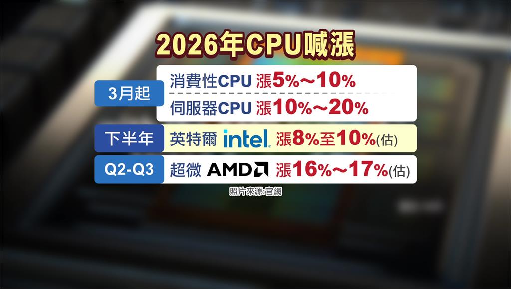 隨著AI從生成邁向自主行動,帶動CPU需求大幅成長,更掀起新一輪漲價潮。3月起,消費性CPU價格已上漲5%至10%,伺服器CPU漲幅更達10%至20%,其中,英特爾4月已再度調漲伺服器CPU售價,市場預期下半年仍有約8%至10%的調漲空間;市場也傳出,超微(AMD)預計將在第二季、第三季分別調漲伺服器CPU價格各一次。