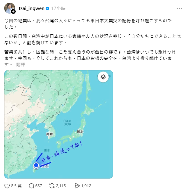 日本近來地震頻繁不平靜,20日才在東北三陸沖發生7.7強震,昨(22)天青森縣又發生5.1規模的極淺層地震,前總統蔡英文昨晚就在threads發日文關心日本朋友,祈禱一切平安,還跟上流行使用最新的「地圖喊話」方式,就有311受災戶留言感謝台灣對日本的救命之恩。