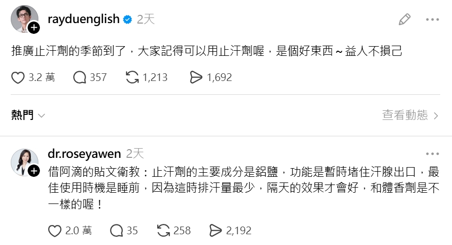 阿滴發文提醒大家使用止汗劑,引發討論。圖/翻攝自Threads@rayduenglish皮膚專科醫師蕭雅文也在該篇貼文進行衛教,提醒止汗劑的使用時機,「止汗劑的主要成分是鋁鹽,功能是暫時堵住汗腺出口,最佳使用時機是睡前,因為這時排汗量最少,隔天的效果才會好,和體香劑是不一樣的喔」。