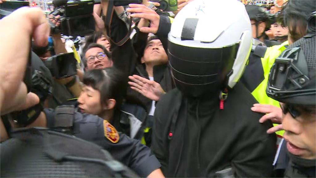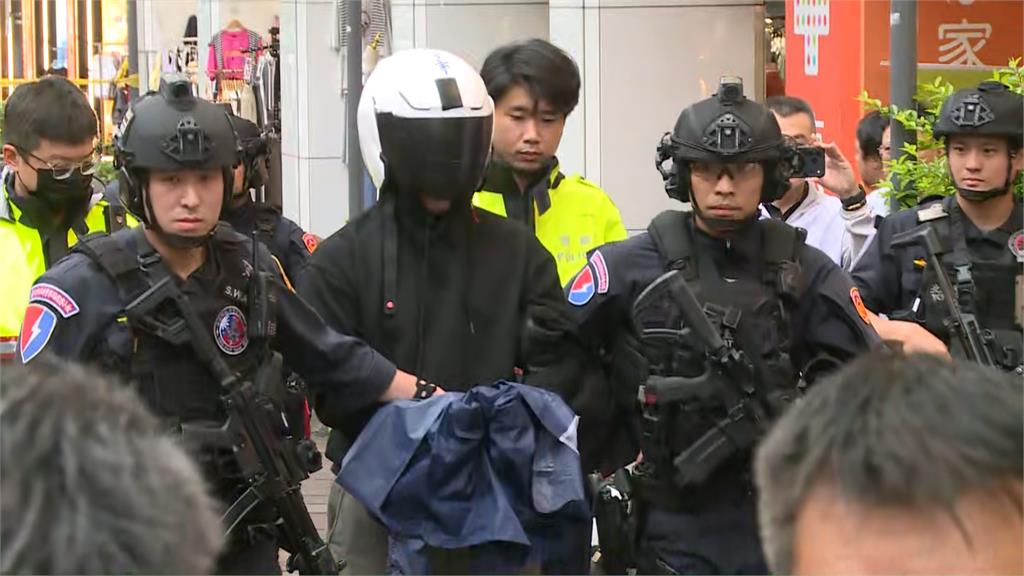 隨後警方在16時45分左右將約31歲的林姓嫌犯帶出,他身穿黑色上衣、短褲及雨鞋,戴上遮住臉部的安全帽、雙手上銬走出現場,被帶上警車後離開。