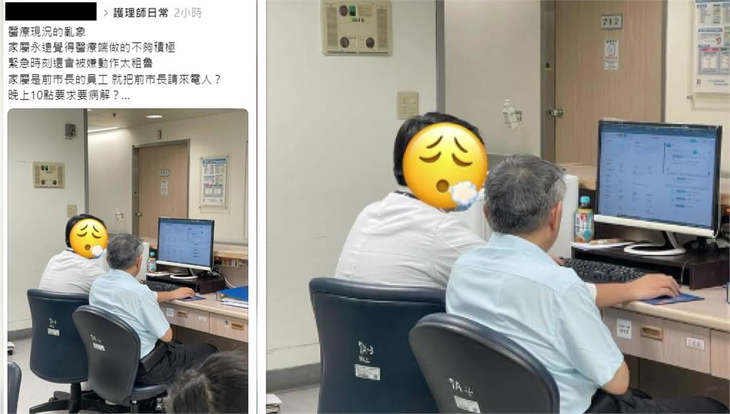 有醫護人員在社群上爆料,有病患家屬是「前台北市長」的員工,就把前市長請到醫院一起了解家人病況,照片雖是背影,但網友一下就認出他就是柯文哲。醫護人員指出,家屬永遠覺得醫療端不夠積極,把前市長請來「電人」,晚上10點還要求病情解釋,「這裡也不是台大,到底憑什麼?」