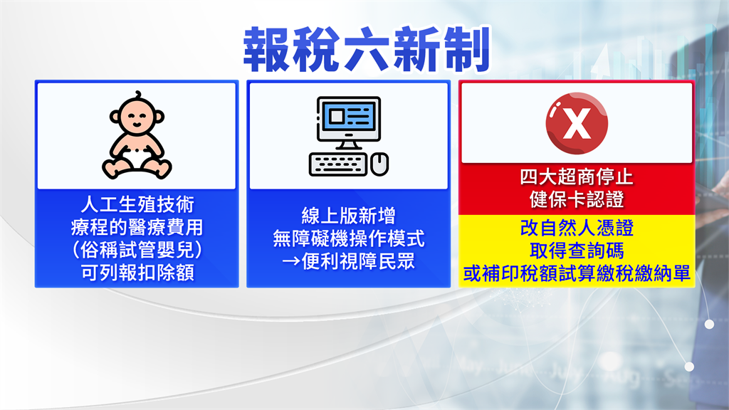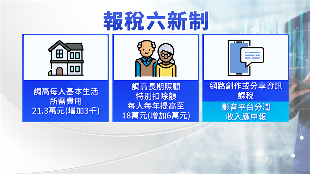 5月報稅季即將到來,今年將有「6大新制」上路,包含基本生活費調升3000元,申報戶基本生活費總額為「21.3萬元乘以申報戶人數」,預計會有202萬戶受惠,減稅利益約129億元;長期照顧特別扣除額調升至18萬元,並擴大適用範圍;另外,針對網路創作者也就是網紅的分潤收入,納入綜所稅申報;人工生殖醫療費用扣除;線上無障礙報稅系統及超商健保卡認證服務取消等新規定。