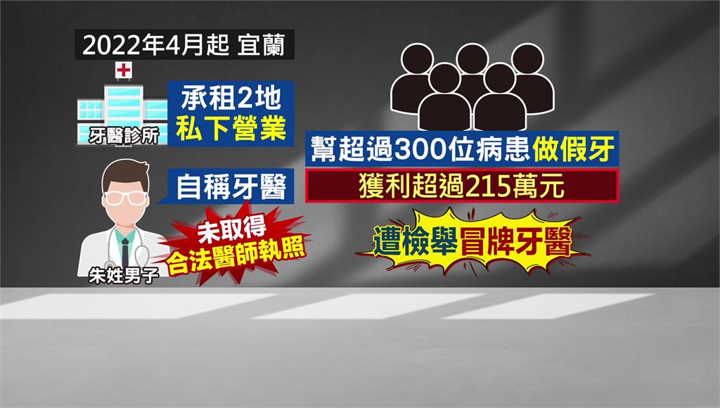 2022年4月開始,朱男在宜蘭承租2處地點擺放醫療器具,還自稱是牙醫師,卻沒有合法醫師執照。並在短短4年內,幫超過300位病患製作假牙,更透過病患口耳相傳的方式攬客,估計獲利超過215萬元,直到有民眾察覺異狀進行檢舉,全案才曝光。