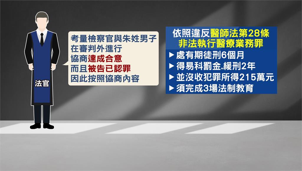 宜蘭地院審理後認為,檢察官和朱男在審判外進行協商達成合意,而且被告已認罪,因此按照協商內容,依照違反醫師法第28條,處有期徒刑6月得易科罰金,緩刑2年,並沒收犯罪所得215萬元,還需要完成3場法制教育。