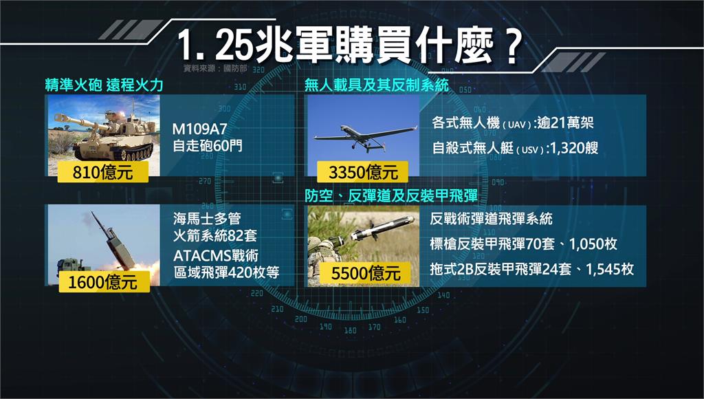 面對台海緊張局勢及中共解放軍的威脅,國防部日前對外釋出「軍購特別條例草案」七大類採購項目公開版的報告,這筆總額高達1.25兆的國防預算中,「防空、反彈道以及反裝甲飛彈」項目的金額為5500億,位居第一。而最引起矚目的還有龐大的無人機隊與自殺式無人艇,目標建構不對稱作戰的嚇阻能力。