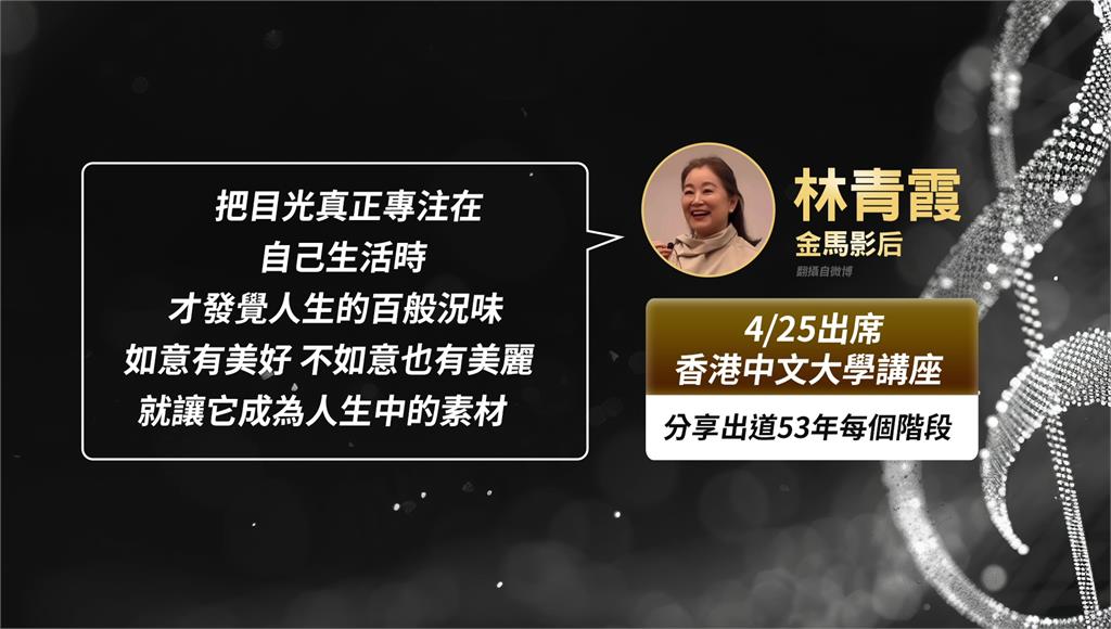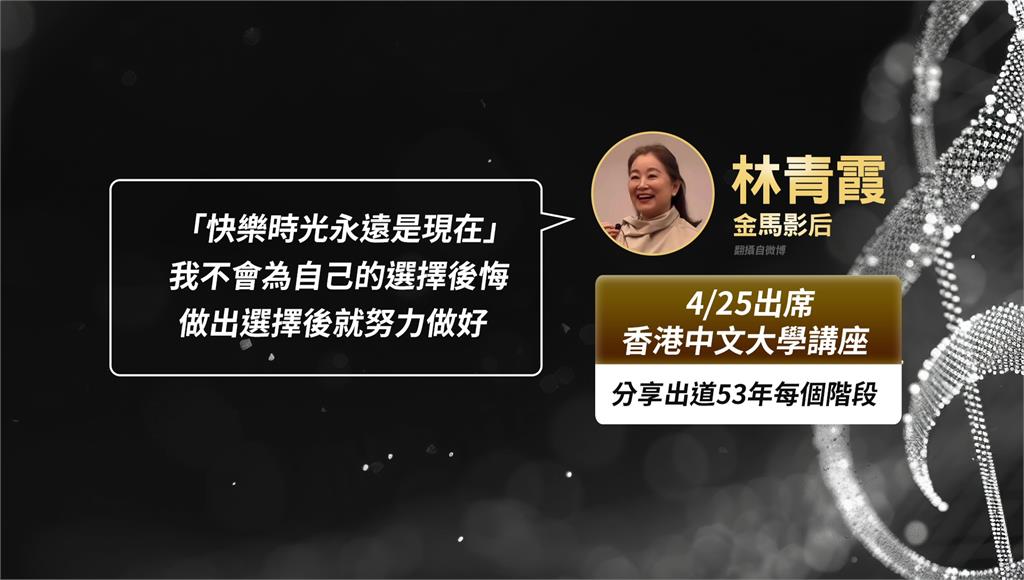 林青霞分享出道53年來的人生歷程,表示「快樂時光永遠是現在」,不會為自己的選擇後悔,做出決定後就努力做好,她也勉勵大家,當真正把目光專注在自己的生活時,才會發現人生百般況味,如意有美好,不如意也有美麗,都能成為人生素材,正能量金句打動觀眾,現場吸引近3千名師生到場,座無虛席,展現高人氣。