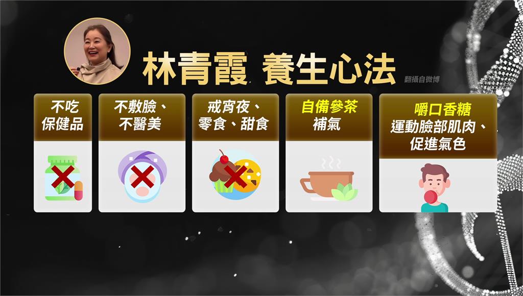 林青霞正能量金句。圖/台視新聞製圖年過70的林青霞,過去出席活動時,總大方展現「歲月痕跡」,不遮掩白髮與細紋,被網友大讚是「優雅老去」的代表。她也曾分享養生心法,不吃保健品、不敷臉、不做醫美,平時自備參茶補氣,並透過嚼口香糖運動臉部肌肉、促進氣色。
