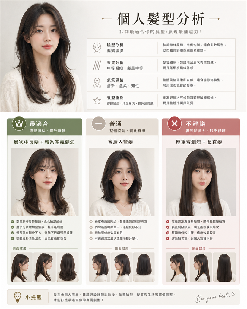 請根據我上傳的人像照片,製作一張高質感個人髮型分析圖卡。保留主角原本五官、臉型與真實特徵,透過對比方式展示不同髮型,清楚區分「最適合」、「普通」與「不建議」髮型,版面設計需清晰易讀。