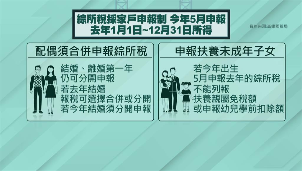 綜所稅採家戶申報制。圖/台視新聞製圖「綜合所得稅」列報扶養有2大注意事項,採用「家戶申報制」,今年5月申報的是去年1月1日至12月31日的所得,而非申報當年度,其中,配偶須合併申報綜所稅,但結婚或離婚的第一年仍可以分開,假如是去年結婚,今年可選擇合併或分開,若是今年結婚就必須分開申報。