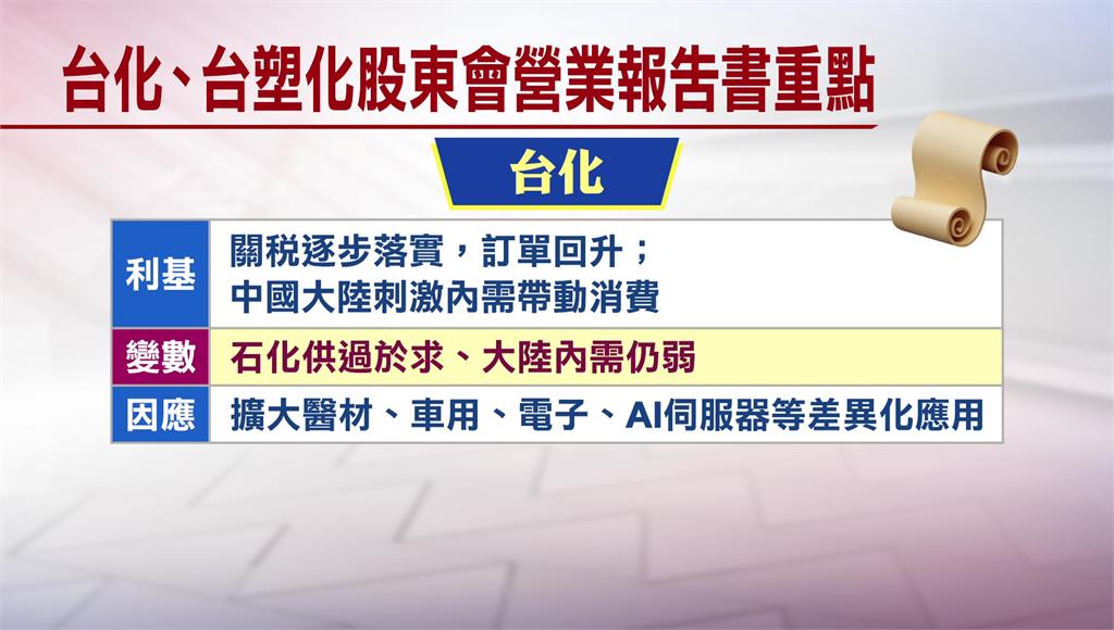 台化股東會營業報告書重點。圖/非凡新聞開工率回升、價格穩定,台塑四寶也將在5月底召開年度股東大會,其中台化及台塑化兩家公司已經先行公布股東會營業報告書。台化展望今年,看利多是關稅逐步落實、訂單回升,但變數仍在於石化供過於求以及大陸內需疲弱問題依舊存在;至於台塑化則將採取彈性且多元的進料策略,降低成本、提升產能利用率。