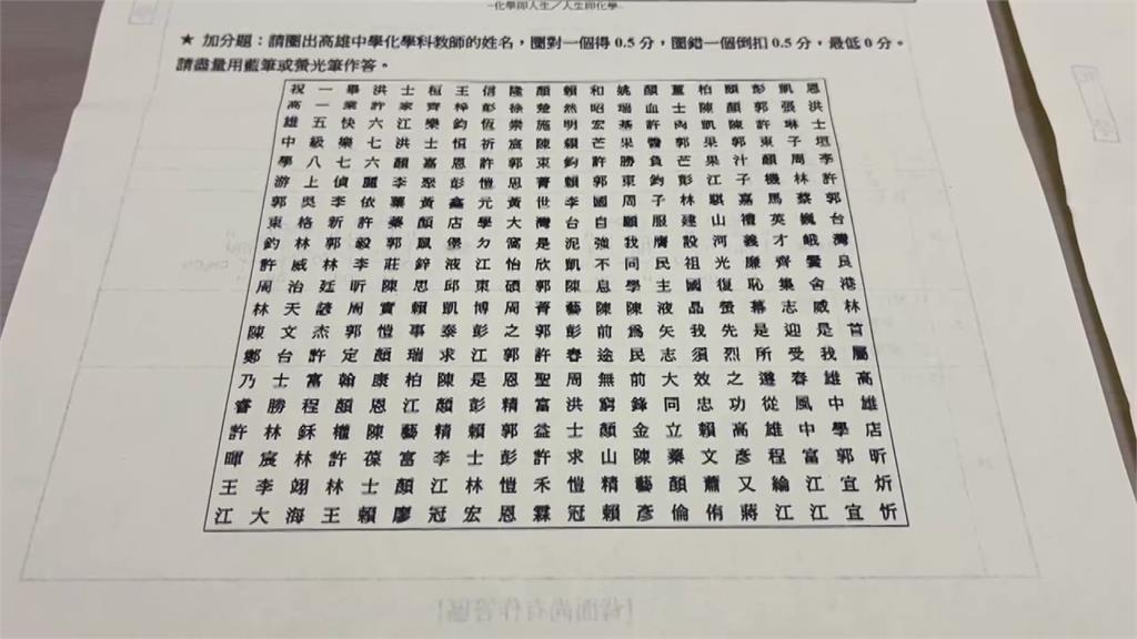 而不只化學科,連國文科也有,「哪一位不是雄中校友?A.陳其邁B.戴資穎C.李多慧D.莊福泰」。加分題一曝光,引起網友熱烈回響,有人說「這題會寫好久好多梗」、「有料」、「超好笑最喜歡這種加分題了」。
